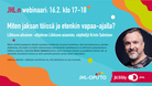 Viimeinen ilmoittautumispäivä 15.2.2021. Webinaari on maksuton JHL:n jäsenille. Linkki JHL:n tapahtumasivulle: https://www.jhl.fi/tapahtuma/miten-jaksan-toissa-ja-etenkin-vapaa-ajalla-liikkuva-asiamies-nayttelija-kristo-salminen-webinaari/